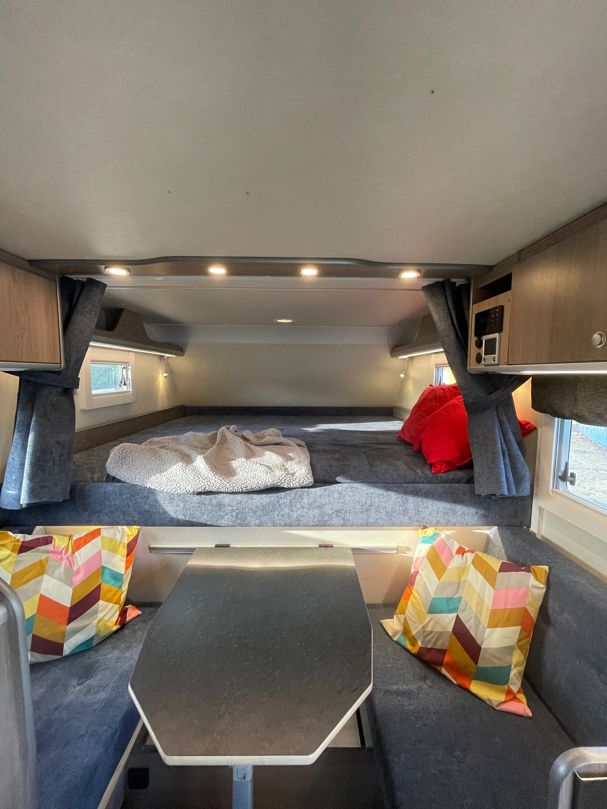Den rymliga bodelen har plats för bekväma sängplatser, ett välutrustat kök, ett praktisk badrum med toalett och dusch. Den vattenburna golvvärmen och konvektorsystemet i världsklass gör att ni kan njuta av er Northen Lights camper året runt.
